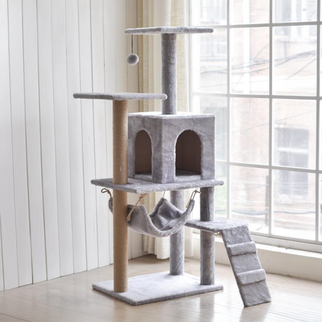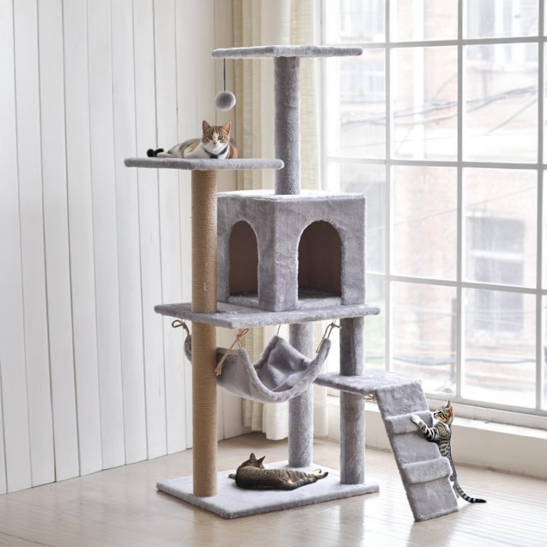 Features multiple platforms and perches covered in soft, plush fabric, allowing cats to climb, explore, and relax.